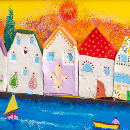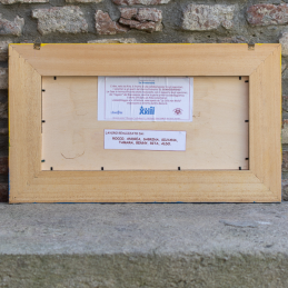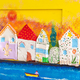 Si tratta di un pezzo unico, originale e diverso da tutti gli altri, le casine sono modellate e colorate una per una secondo il gusto e l’ispirazione delle ragazze, le assi di legno sono recuperate da materiali che altrimenti sarebbero andati sprecati e il dipinto è frutto di fantasia. Il quadro è frutto della collaborazione tra operatori, volontari e ragazze del laboratorio.