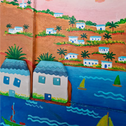 Un caldo orizzonte dorato: al centro un grande sole che illumina colline, casine e un mare tranquillo, mentre piccoli dettagli rosa punteggiano il cielo. Le casette in rilievo sono modellate e dipinte una per una, creando un gioco di volumi e colori che cattura lo sguardo.