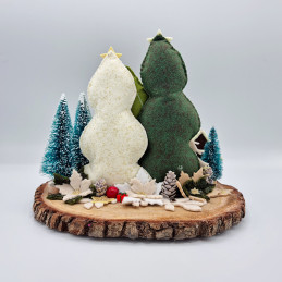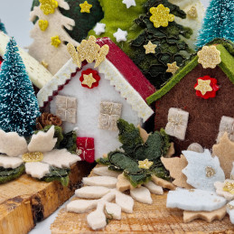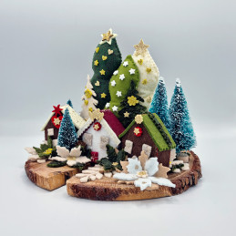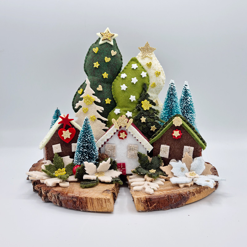 Un paesaggio invernale dai toni verdi e naturali, che unisce casette in feltro, alberelli e decori scintillanti su una base in legno: un piccolo mondo da esporre al centro della tavola o su una mensola per creare un angolo natalizio dal sapore artigianale.