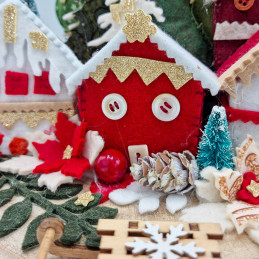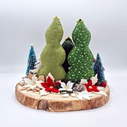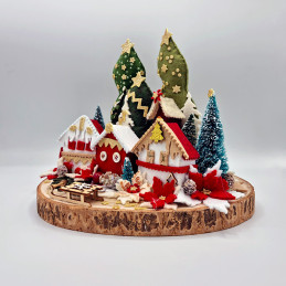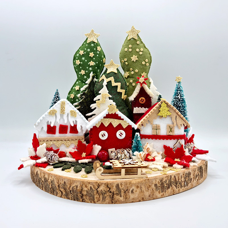 Un paesaggio invernale dai toni verdi e naturali, che unisce casette in feltro, alberelli e decori scintillanti su una base in legno: un piccolo mondo da esporre al centro della tavola o su una mensola per creare un angolo natalizio dal sapore artigianale.