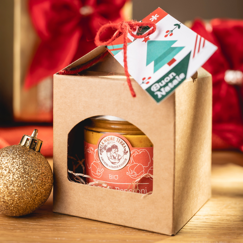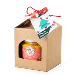 Confezione regalo gastronomica natalizia composta da scatola avana contenente un vasetto di Crema di Peperoni da 200 g