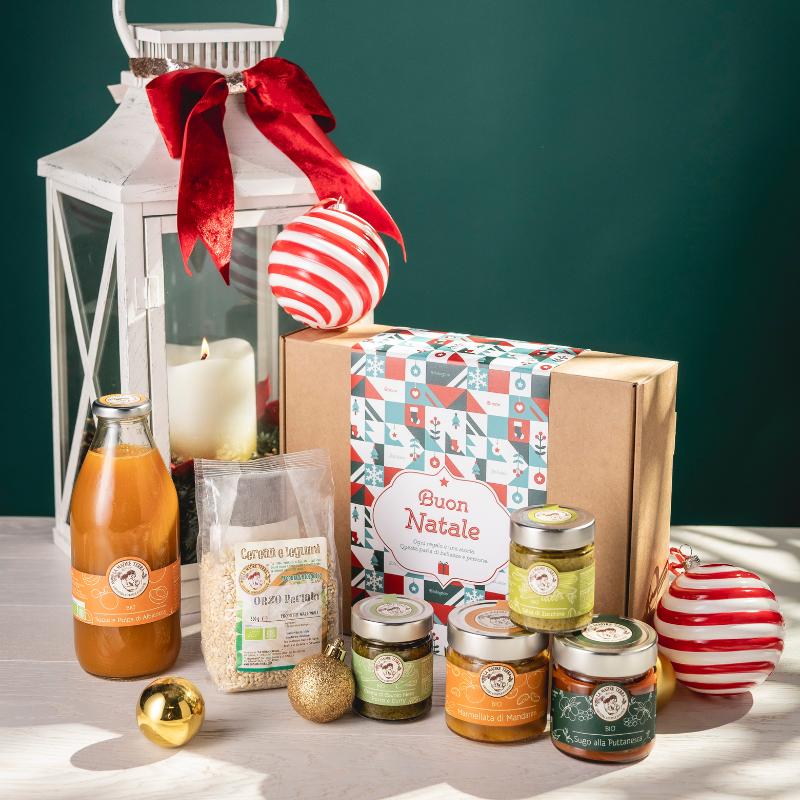 Confezione regalo gastronomica natalizia composta da scatola avana contenente i seguenti prodotti: