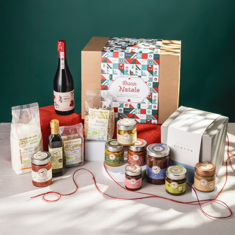 Confezione regalo gastronomica natalizia composta da scatola avana contenente i seguenti prodotti: